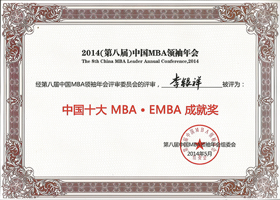 2014年5月4日,公司董事長(zhǎng)李銀祥在2014(第八屆)中國(guó)MBA領(lǐng)袖年會(huì)上榮獲“中國(guó)十大MBA EMBA成就獎(jiǎng)”。