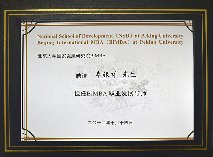 2014年10月,李銀祥被北京大學(xué)國(guó)家發(fā)展研究院聘任為“BiMBA職業(yè)發(fā)展導(dǎo)師”。