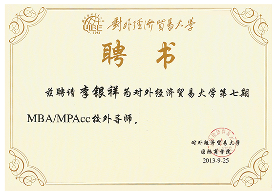 2013年9月25日,董事長(zhǎng)李銀祥被對(duì)外經(jīng)濟(jì)貿(mào)易大學(xué)聘任為MBA/MPAcc校外導(dǎo)師。
