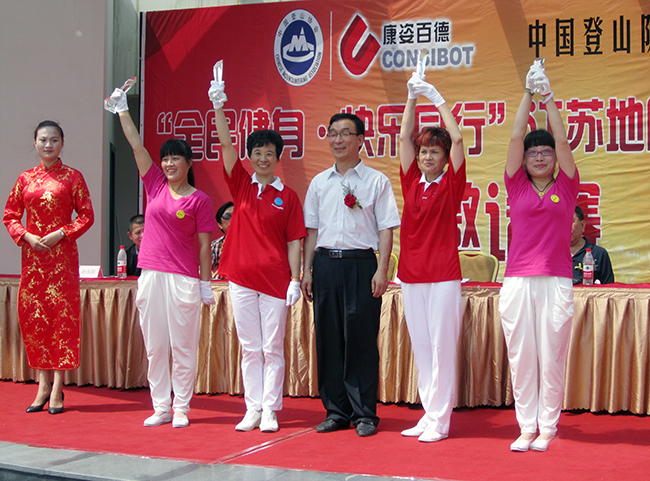 5月25日上午11時,中國登山隊攜手康姿百德舉辦的“全民健身·快樂同行”康姿百德第二套健身操邀請賽江蘇地區(qū)比賽在江蘇太倉舉行。來自江蘇各地區(qū)的18個代表隊共計600余名健身愛好者參加了此次比賽。 參加此次比賽的主要嘉賓有:中國登山協(xié)會副會長楊文祥、原張家港工商局局長焦兀、太倉市城廂鎮(zhèn)工商分局書記楊振華、太倉市保護消費者協(xié)會秘書長鄒雁、太倉曲藝指導委員會秘書長徐兆群、康姿百德公司董事長、總經(jīng)理李銀祥等。 中國登山隊攜手康姿百德“全民健身·快樂同行”大型公益活動,于2012年在全國開展以來,受到了社會各方面的廣泛關注。為了將“全民健身·快樂同行”大型公益活動進一步引向深入,讓更多的人走出家門,參加全民健身運動,中國登山隊,秦皇島康姿百德高新技術開發(fā)有限公司,決定聯(lián)合舉辦“全民健身·快樂同行”康姿百德健身操邀請賽,江蘇地區(qū)是本次邀請賽初賽的第一站。 在比賽中,身著紅色演出服的青年歌手楊德朗站在車上出場,演唱了他的原創(chuàng)歌曲《最美中國人》。這首歌曲是康姿百德第二套健身操的背景音樂之一,全體參賽的健身愛好者隨著音樂而舞動,統(tǒng)一的著裝、整齊的動作、飽滿的熱情,將本次比賽推向了高潮。 經(jīng)評比,18個代表隊分獲“最佳表演獎”、“團隊建設獎”、“最佳組織獎”等獎項,這些健身操愛好者將在9月份來到秦皇島參加“全民健身·快樂同行”康姿百德健身操邀請賽的展演,勢將引起新一輪的康姿百德健身熱潮。