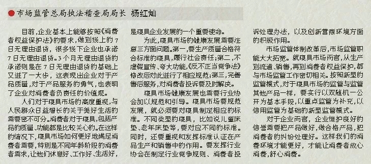 為此,寢具市場的健康發(fā)展需要注意三方面問題。第一,要生產(chǎn)質(zhì)量合格符合標(biāo)準(zhǔn)的寢具,履行社會責(zé)任;第二,不虛假宣傳、夸大功能,《反不正當(dāng)競爭法》修改后對此進(jìn)行了相應(yīng)規(guī)范;第三,完善售后服務(wù),對消費(fèi)者投訴要及時解決。