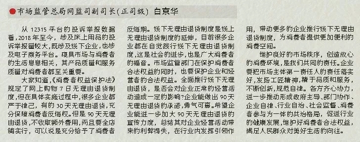 大家知道,《消費(fèi)者權(quán)益保護(hù)法》規(guī)定了網(wǎng)上購物7日無理由退貨制度,但在具體實(shí)施過程中,很多企業(yè)都嚴(yán)于律己,有的30天無理由退貨,充分保障消費(fèi)者反悔權(quán)。但是90天無理由退貨,不收取額外費(fèi)用,而且要全店鋪實(shí)行,可以說是充分給予了消費(fèi)者反悔期。線下無理由退貨制度是線上無理由退貨制度的延伸,目前很多企業(yè)都在自覺踐行線下無理由退貨制度,這是社會的進(jìn)步,也是廣大消費(fèi)者的福音。市場監(jiān)管部門在保護(hù)消費(fèi)者合法權(quán)益的同時,也要保護(hù)企業(yè)和經(jīng)營者的合法權(quán)益。全面推行線下無理由退貨,是否會對企業(yè)正常的經(jīng)營活動造成一定的影響?企業(yè)能做出90天無理由退貨的承諾,勇氣可嘉。希望企業(yè)能進(jìn)一步加大90天無理由退貨的宣傳力度,總結(jié)其對企業(yè)經(jīng)營活動帶來的利弊得失,在行業(yè)內(nèi)發(fā)揮引領(lǐng)作用,帶動更多的企業(yè)推行線下無理由退貨制度,為消費(fèi)者提供更加便利的消費(fèi)空間。