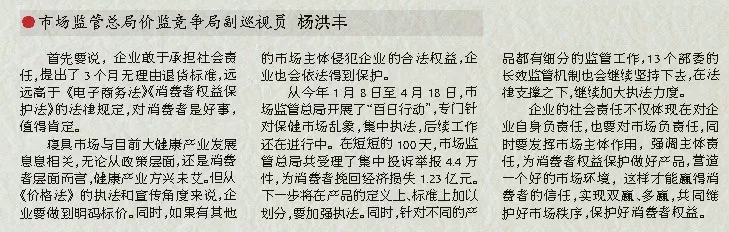 企業(yè)的社會責(zé)任不僅體現(xiàn)在對企業(yè)自身負(fù)責(zé)任,也要對市場負(fù)責(zé)任,同時要發(fā)揮市場主體作用,強(qiáng)調(diào)主體責(zé)任,為消費(fèi)者權(quán)益保護(hù)做好產(chǎn)品,營造一個好的市場環(huán)境,這樣才能贏得消費(fèi)者的信任,實(shí)現(xiàn)雙贏、多贏,共同維護(hù)好市場秩序,保護(hù)好消費(fèi)者權(quán)益。