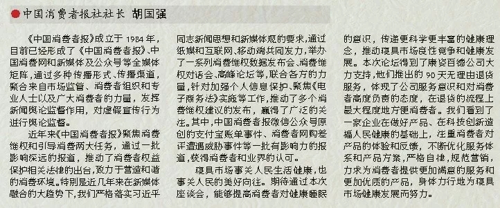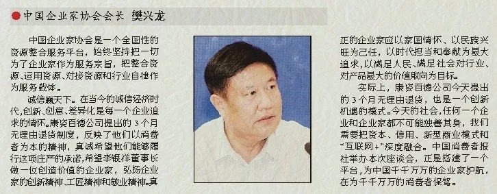 實(shí)際上,康姿百德公司今天提出的3個月無理由退貨,也是一個創(chuàng)新機(jī)遇的模式。今天的社會,任何一個企業(yè)和企業(yè)家都不可能獨(dú)善其身,我們需要把資本、信用、新型商業(yè)模式和“互聯(lián)網(wǎng)+”深度融合。中國消費(fèi)者報社舉辦本次座談會,正是搭建了一個平臺,為中國千千萬萬的企業(yè)家護(hù)航,在為千千萬萬的消費(fèi)者保駕。