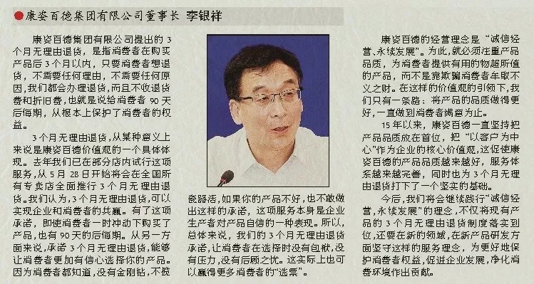 誠信贏天下。在當(dāng)今的誠信經(jīng)濟(jì)時代,創(chuàng)新、創(chuàng)意、差異化是每一個企業(yè)追求的情懷??底税俚鹿咎岢龅?個月無理由退貨制度,反映了他們以消費(fèi)者為本的精神,真誠希望他們能夠履行這項(xiàng)莊嚴(yán)的承諾,希望李銀祥董事長做一位創(chuàng)造價值的企業(yè)家,弘揚(yáng)企業(yè)家的創(chuàng)新精神、工匠精神和敬業(yè)精神。真正的企業(yè)家應(yīng)以家國情懷、以民族興旺為己任,以時代擔(dān)當(dāng)和奉獻(xiàn)為最大追求,以滿足人民、滿足社會對行業(yè)、對產(chǎn)品最大的價值取向?yàn)槟繕?biāo)。