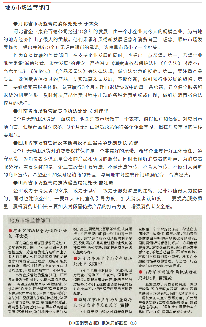 中國消費(fèi)者報訊 為構(gòu)建良好的消費(fèi)環(huán)境,規(guī)范寢具市場秩序,推動寢具行業(yè)自律和健康發(fā)展,由中國消費(fèi)者報社主辦、康姿百德集團(tuán)有限公司協(xié)辦的“寢具市場秩序與消費(fèi)者權(quán)益保護(hù)”座談會于2019年5月28日在北京召開,來自國家市場監(jiān)督管理總局相關(guān)司局、中國企業(yè)家協(xié)會的相關(guān)領(lǐng)導(dǎo)、專家及寢具知名企業(yè)代表,圍繞消費(fèi)者權(quán)益保護(hù)、促進(jìn)寢具市場良性競爭與規(guī)范發(fā)展等話題進(jìn)行了深入探討。本次座談會上,與會代表共同見證了康姿百德公司承諾“3個月無理由退貨”啟動儀式。