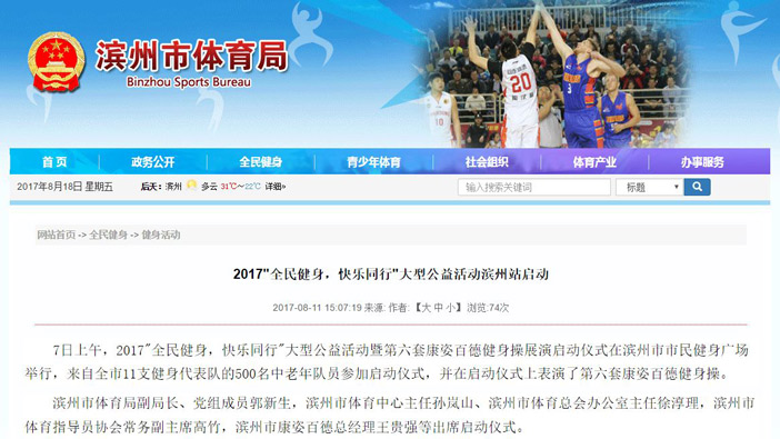 山東濱州體育局登載康姿百德健身操展演活動信息