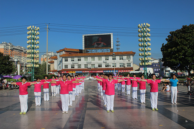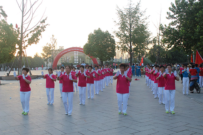 為深入推廣“全民健身”活動,8月12日,江蘇邳州體育局組織廣大健身愛好者舉行了廣場舞表演,近200人組成的康姿百德健身操代表隊深受廣大市民好評。 上午8時,邳州人民廣場上,一群身穿粉紅色T恤衫的人們,精神飽滿,意氣風發(fā),隨著音樂的旋律,富有節(jié)奏地伸臂踢腿,提臀扭腰,盡情展現(xiàn)著康姿百德健身操的明快與活力。大家獨具一格的表演,為本次活動構(gòu)筑了一道亮麗的風景線,引得廣大市民駐足觀賞、一致叫好。