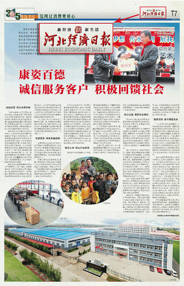 以下是《河北經(jīng)濟日報》以“誠信服務(wù)客戶,積極回饋社會”為主題對康姿百德的報道。
