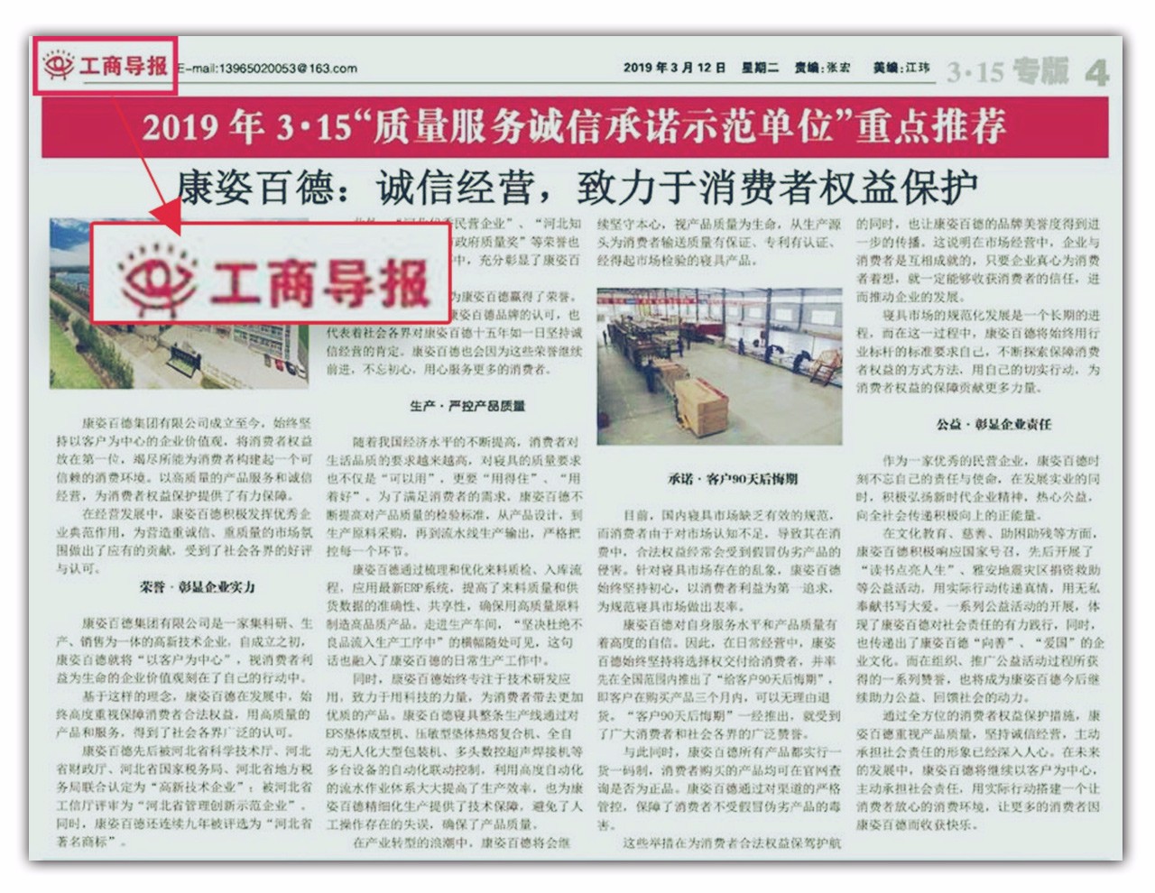 3·15消費者權(quán)益日來臨之際,康姿百德受邀參加2019紀念“3?15”國際消費者權(quán)益日座談會,《中國消費者報》等多家權(quán)威媒體也相繼對康姿百德進行報道。