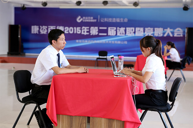 “我參加工作以來一直從事行政管理相關(guān)的工作,對(duì)公司日常行政管理工作有更深的理解,這個(gè)是我競(jìng)聘行政主管的優(yōu)勢(shì)……”7月2日,在康姿百德科技園辦公樓三樓會(huì)議室,參加康姿百德2015年第二屆述職暨競(jìng)聘大會(huì)的行政專員馮璐正在向評(píng)審團(tuán)進(jìn)行面試答辯。這也是此次競(jìng)聘大會(huì)最為重要的一個(gè)環(huán)節(jié)。