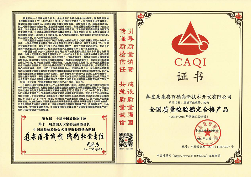 此外,康姿百德還分別榮獲3.15主題活動中“全國產品和服務質量誠信示范企業(yè)”、“全國質量檢驗穩(wěn)定合格產品”兩項榮譽。