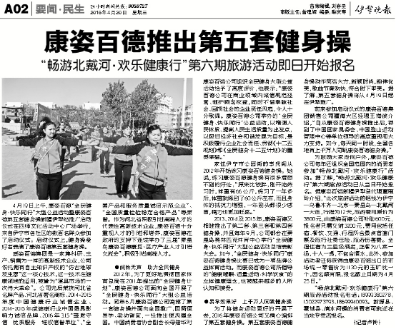 2016年4月初,康姿百德“全民健身·快樂同行”大型公益活動(dòng)暨康姿百德第五套健身操啟動(dòng)儀式相繼在北戴河、南昌舉行,此次新疆站是健身操啟動(dòng)儀式的第三站。《伊犁日?qǐng)?bào)》、《伊犁晚報(bào)》等媒體對(duì)此次活動(dòng)進(jìn)行了報(bào)道。
