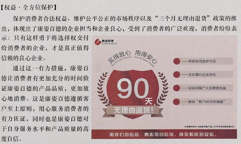 【權(quán)益·全方位保護(hù)】保護(hù)消費(fèi)者合法權(quán)益、維護(hù)公平公正的市場(chǎng)秩序以及“三個(gè)月無(wú)理由退貨”政策的推出,體現(xiàn)出了康姿百德的企業(yè)擔(dān)當(dāng)和企業(yè)良心,受到了消費(fèi)者的廣泛歡迎,消費(fèi)者紛紛表示:只有這樣勇于將選擇權(quán)交付給消費(fèi)者的企業(yè),才是真正值得信賴的良心企業(yè)。