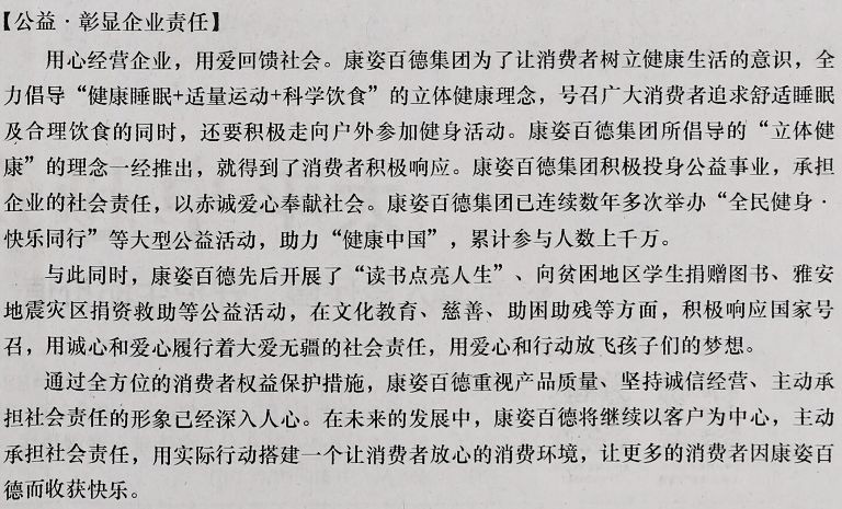【公益·彰顯企業(yè)責(zé)任】用心經(jīng)營(yíng)企業(yè),用愛回饋社會(huì)。康姿百德集團(tuán)為了讓消費(fèi)者樹立健康生活的意識(shí),全力倡導(dǎo)“健康睡眠+適量運(yùn)動(dòng)+科學(xué)飲食”的立體健康理念,號(hào)召?gòu)V大消費(fèi)者追求舒適睡眠及合理飲食的同時(shí),還要積極走向戶外參加健身活動(dòng)??底税俚录瘓F(tuán)所倡導(dǎo)的“立體健康”的理念一經(jīng)推出,就得到了消費(fèi)者積極響應(yīng)??底税俚录瘓F(tuán)積極投身公益事業(yè),承擔(dān)企業(yè)的社會(huì)責(zé)任,以赤誠(chéng)愛心奉獻(xiàn)社會(huì)。