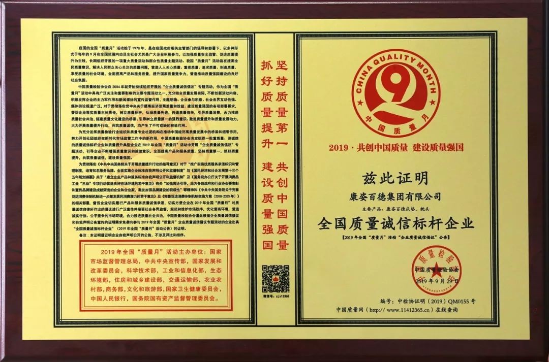 康姿百德榮獲“全國質(zhì)量誠信標(biāo)桿企業(yè)”