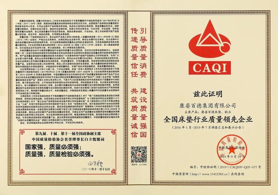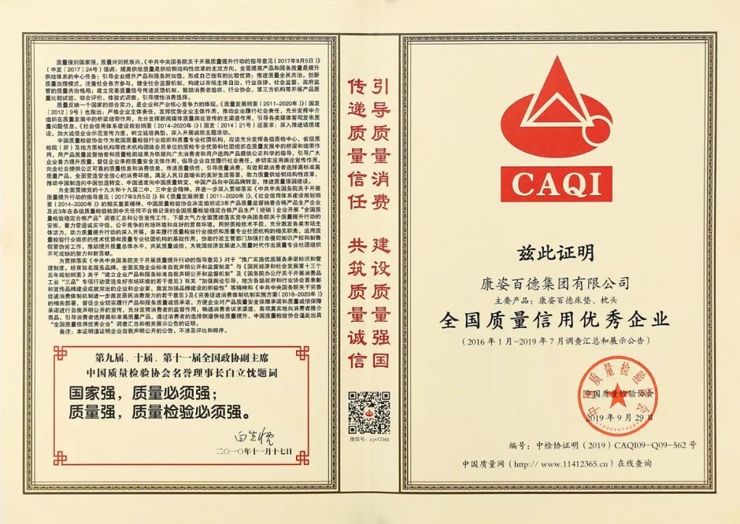 康姿百德再次被授予“全國質(zhì)量誠信標(biāo)桿企業(yè)”的殊榮,更加堅定了康姿百德“質(zhì)量先行”的發(fā)展步伐,同時也更加推動了康姿百德積極落實質(zhì)量主體責(zé)任,樹立行業(yè)質(zhì)量標(biāo)桿,引導(dǎo)市場質(zhì)量消費,進(jìn)一步鞏固了康姿百德標(biāo)桿企業(yè)的行業(yè)地位。