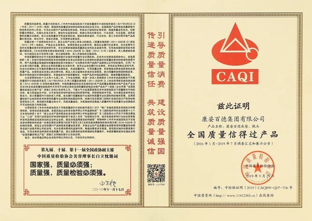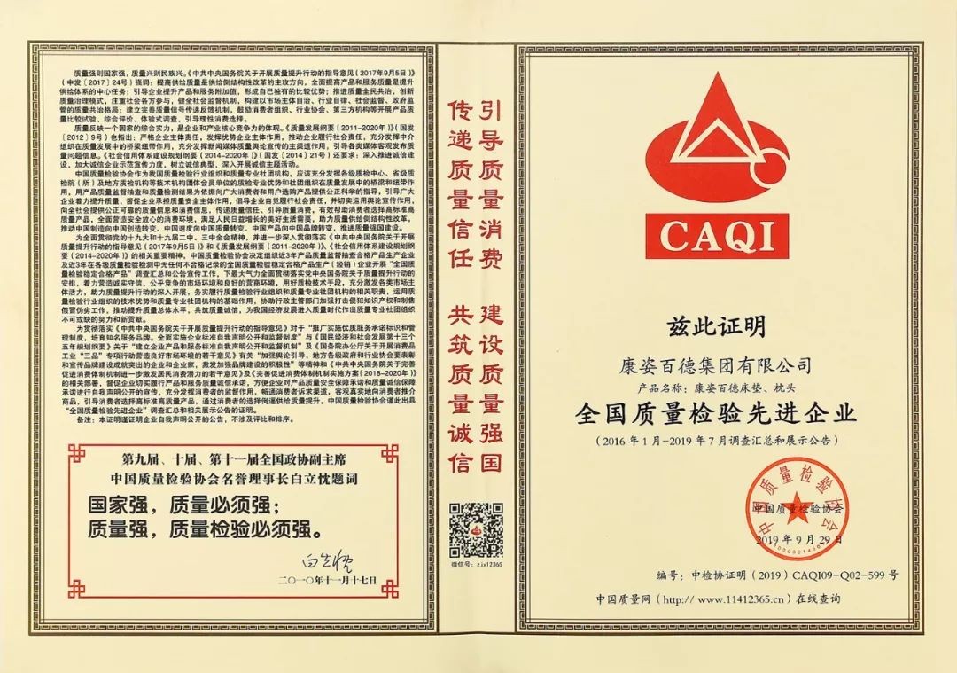 康姿百德產(chǎn)品被評為“全國質(zhì)量檢驗先進(jìn)企業(yè)”