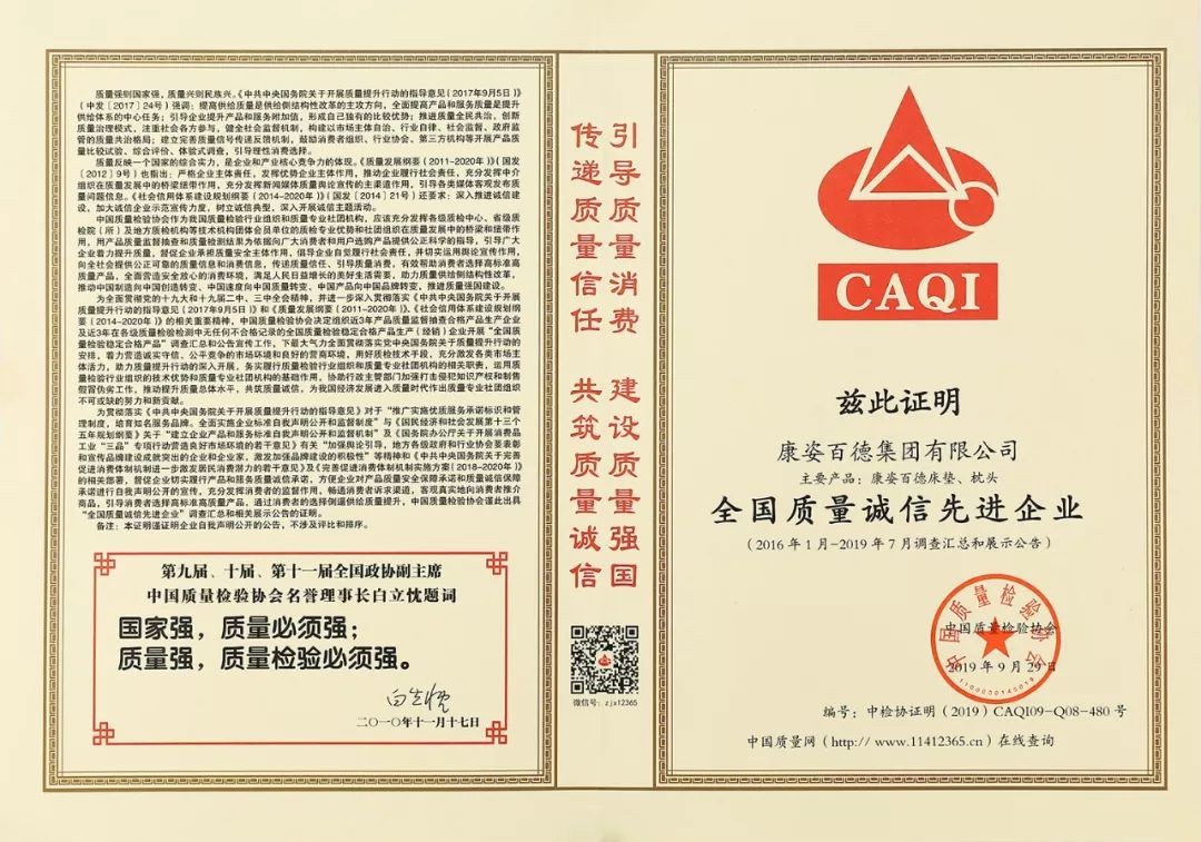 康姿百德產(chǎn)品被評為“全國質(zhì)量誠信先進(jìn)企業(yè)”