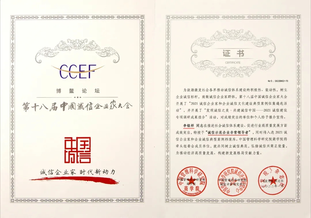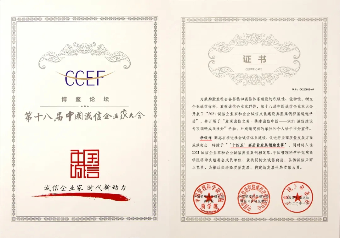 中國誠信企業(yè)家大會(huì)期間,經(jīng)中國管理科學(xué)研究院商學(xué)院學(xué)術(shù)委員會(huì)評定,李銀祥董事長還被聘任為中國管理科學(xué)研究院商學(xué)院“十四五”規(guī)劃編制專家組成員。
