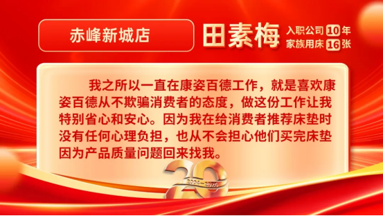 田素梅還說道:“我之所以一直在康姿百德工作,就是喜歡康姿百德從不欺騙消費(fèi)者的態(tài)度,做這份工作讓我特別省心和安心。因?yàn)槲以诮o消費(fèi)者推薦床墊時(shí)沒有任何心理負(fù)擔(dān),也從不會(huì)擔(dān)心他們買完床墊因?yàn)楫a(chǎn)品質(zhì)量問題回來找我。今年是康姿百德成立20周年,我覺得公司能夠發(fā)展的越來越好、越來越壯大,離不開認(rèn)真做產(chǎn)品,真誠(chéng)對(duì)待消費(fèi)者。希望我能在這么好的公司一直干到退休?!?/span>