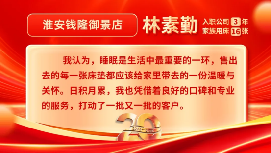 作為康姿百德專(zhuān)賣(mài)店的店員,林素勤常常掛在嘴邊的一句話就是“在崗一分鐘,敬業(yè)60秒”。每一分、每一秒都要?jiǎng)?chuàng)造價(jià)值。她的這份敬業(yè)不僅表現(xiàn)在不溜崗、不空崗,不忙的時(shí)候她還會(huì)花心思布置展區(qū)、學(xué)習(xí)產(chǎn)品知識(shí),以最充足的準(zhǔn)備迎接客戶。她一直認(rèn)為,成交不是銷(xiāo)售的終止,在征集客戶同意的前提下,她會(huì)做不定期的售后追蹤,及時(shí)解決客戶在使用中遇到的問(wèn)題,并給予正確指導(dǎo)。她認(rèn)為,睡眠是生活中最重要的一環(huán),售出去的每一張床墊都應(yīng)該給家里帶去的一份溫暖與關(guān)懷。日積月累,林素勤用她良好的口碑和專(zhuān)業(yè)的服務(wù),打動(dòng)了一批又一批的客戶。