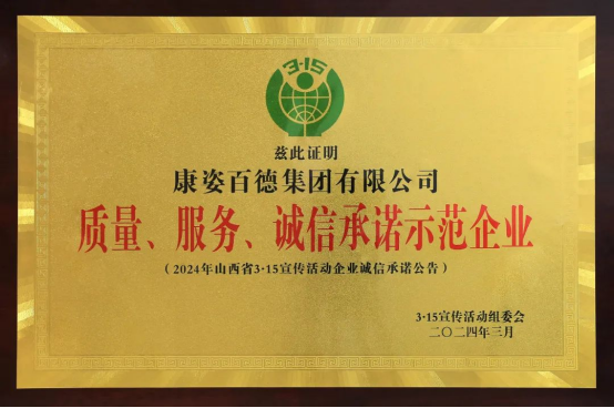康姿百德被山西315宣傳活動(dòng)組委會(huì)授予“質(zhì)量 服務(wù) 誠(chéng)信承諾示范企業(yè)”榮譽(yù)稱號(hào)