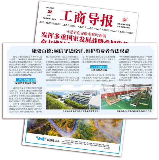 《工商導(dǎo)報(bào)》是安徽省工商聯(lián)主管,安徽省總商會(huì)主辦的面向全國(guó)公開(kāi)發(fā)行的報(bào)刊?!豆ど虒?dǎo)報(bào)》以“康姿百德:誠(chéng)信守法經(jīng)營(yíng),維護(hù)消費(fèi)者合法權(quán)益”為題對(duì)康姿百德進(jìn)行報(bào)道。
