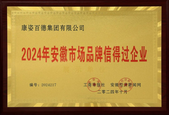 “2024年安徽市場(chǎng)品牌信得過(guò)企業(yè)”榮譽(yù)稱號(hào)