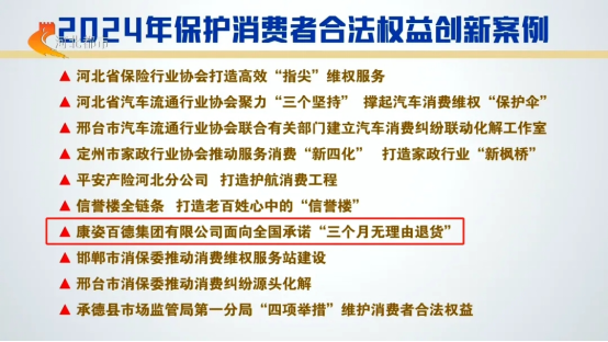 3月15日晚,河北廣播電視臺(tái)聯(lián)合河北省市場(chǎng)監(jiān)督管理局、河北省消費(fèi)者權(quán)益保護(hù)委員會(huì)、全國(guó)16省市電視臺(tái)推出的3·15特別節(jié)目中,河北省消費(fèi)者權(quán)益保護(hù)委員會(huì)秘書長(zhǎng) 王守用現(xiàn)場(chǎng)宣布了2024年保護(hù)消費(fèi)者合法權(quán)益創(chuàng)新案例??底税俚录瘓F(tuán)有限公司面向全國(guó)承諾“三個(gè)月無理由退貨”,成功入選。