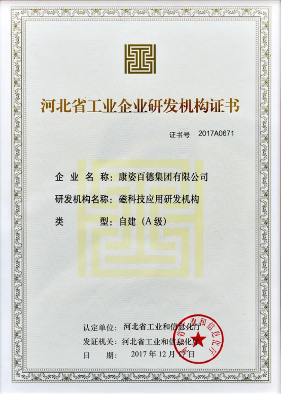 康姿百德在研發(fā)經費占比、在研項目數(shù)量、知識產權產出等方面均遠超河北省工業(yè)和信息化廳的基本要求,展現(xiàn)出系統(tǒng)化、規(guī)模化的研發(fā)實力。該榮譽充分說明了康姿百德在磁應用技術領域的領先地位,是對康姿百德在磁科技領域所做貢獻的認可。